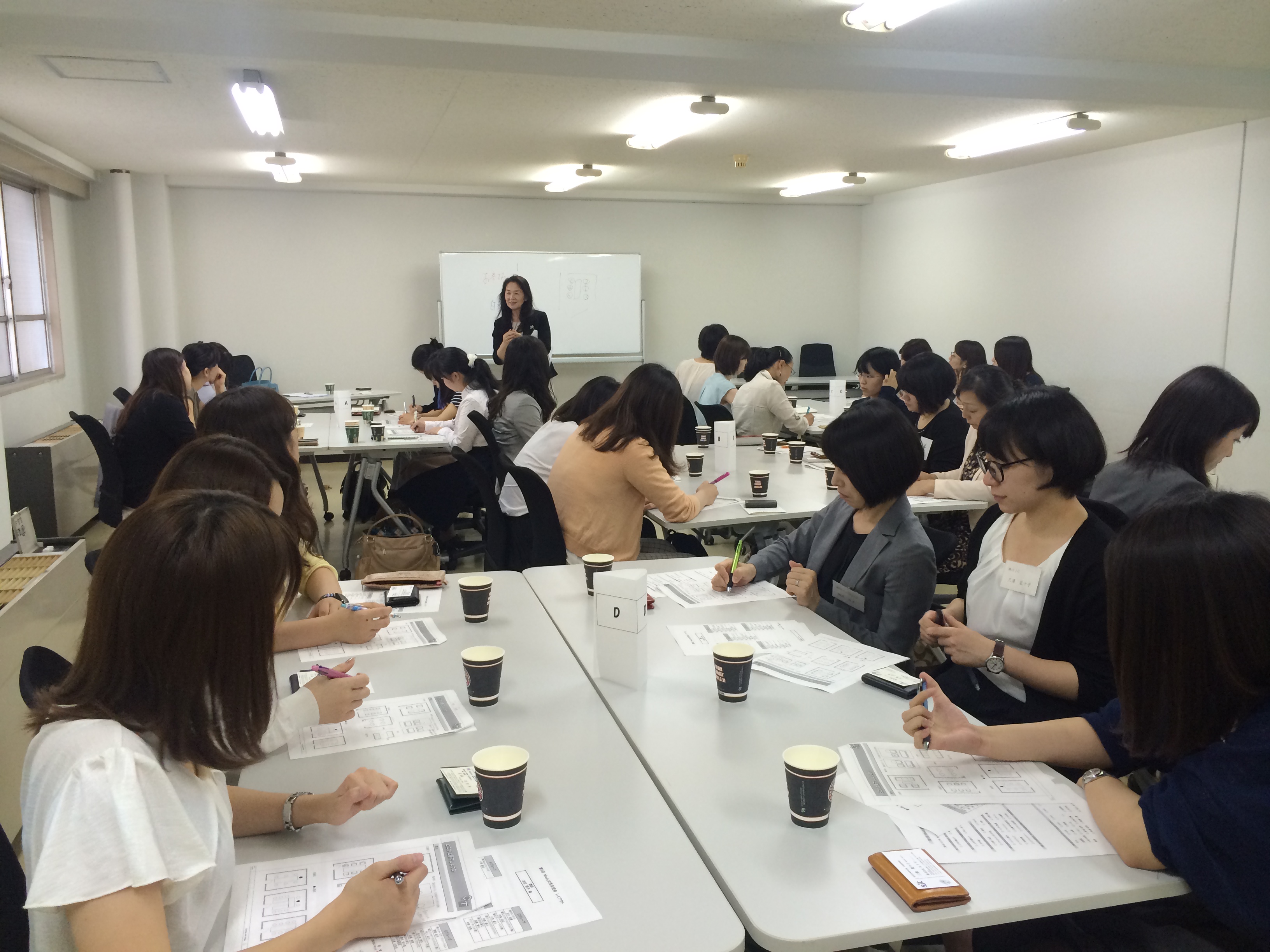 講師にキャリアトーク代表の志伯暁子先生を迎え、お辞儀の仕方、会議室の上座と下座、お茶の出し方など、クイズ形式もとりいれた講義で楽しく学びました。